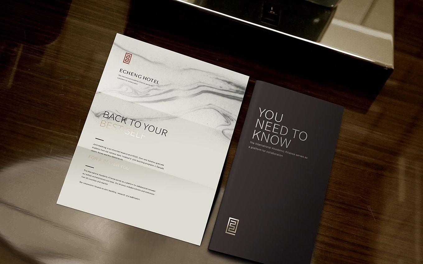 怡程酒店,Logo形如一條朱砂紅的東方龍, Logo造型隱含有怡程的英文首字E字結(jié)構(gòu)的咬合,E-EASTERN,代表東方,凸顯東方情懷和西方現(xiàn)代相結(jié)合的品牌特征。